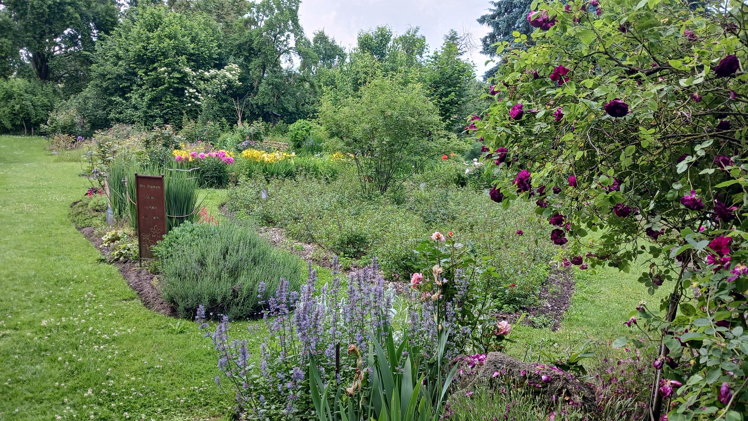 Kräuterrasenflächen wechseln sich mit Nutz- und Ziergehölzen, Hecken, Rosen, Stauden-, Gemüse-, Hoch, und Kräuterbeeten ab.